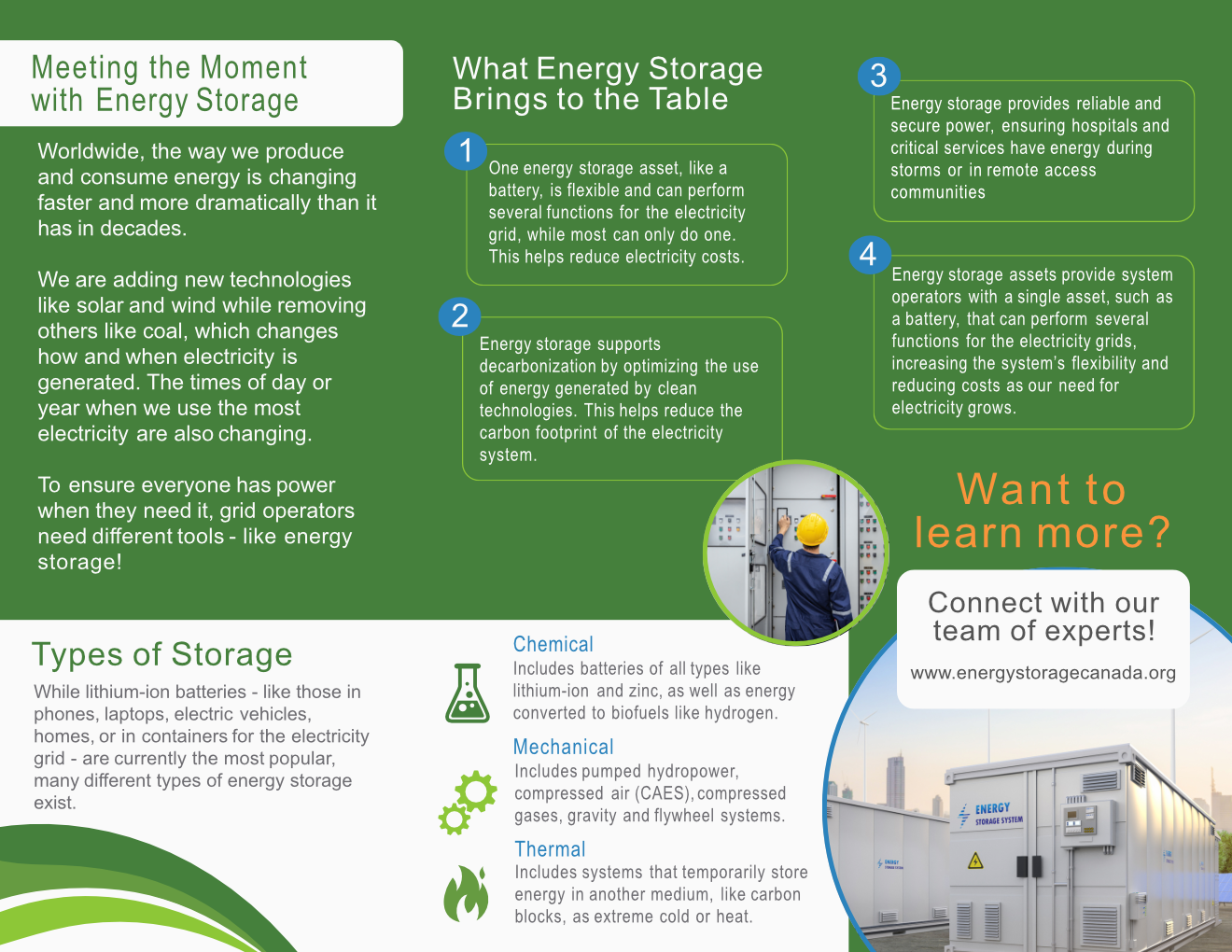 Energy storage captures energy when it is produced and stores it for later use through a variety of technologies including, but not limited to, pumped hydro, batteries, compressed air, hydrogen storage and thermal storage.